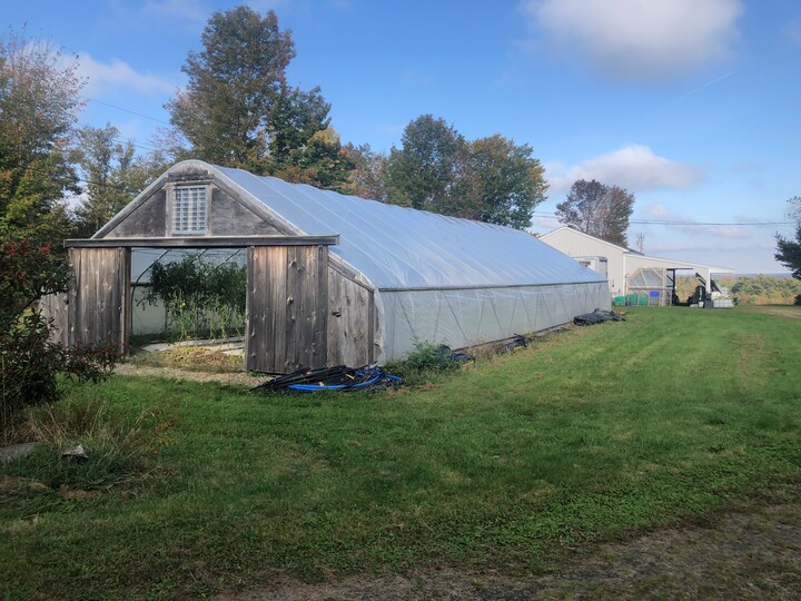 Agricultural infrastructure including a barn (24’ x 32’ with a lean to (16’ x 32’), high tunnel (30’ x 72’), and two small cabins. One of the cabins has been converted into a kitchen space and the other needs repair or replacement. The high tunnel currently has a skin that is aged and will need to be replaced. There is an irrigation system and a drilled well (12 gpm). There is currently no housing on the property, however, a septic system was installed in 2023, and the site is equipped for electric and septic hookup for a tiny house or RV.